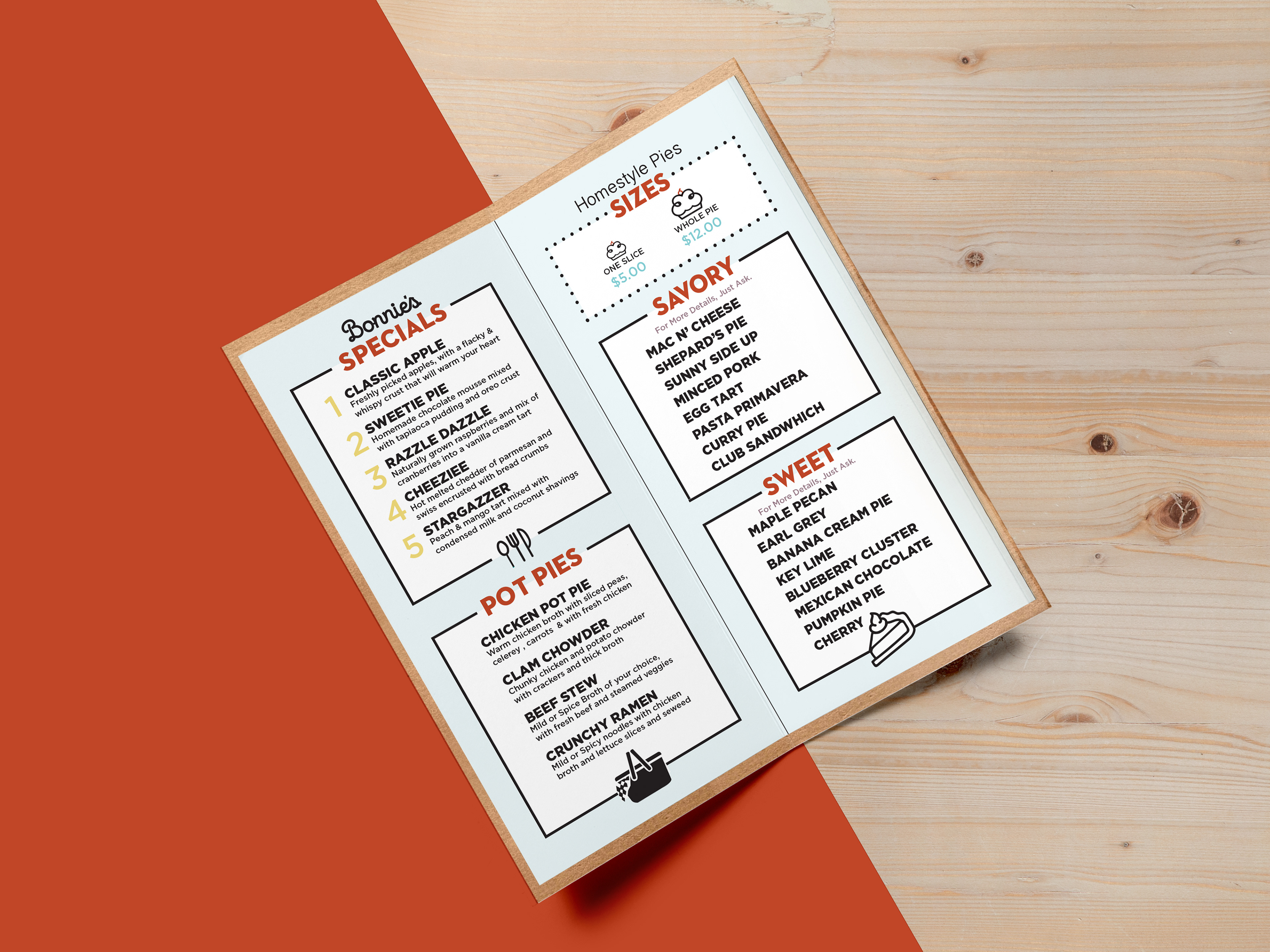 Objective: Bonnie's Pie Shop is a family-friendly restaurant that sells homemade pies. Bonnie wanted to create a simple, cozy place reminiscent of the 1970s, a time she felt was less rushed. The brand celebrates handcrafted pies and fosters a sense of family. The goal is to provide a blissful environment where customers can enjoy a comforting, homemade meal with loved ones, whether they dine in or take a pie to go for a relaxing picnic.
